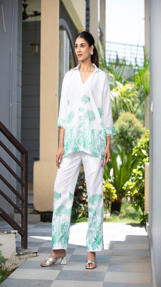 Nila Green Cotton Linen Co-ord Set – Shirt Collar, 3/4 Sleeves