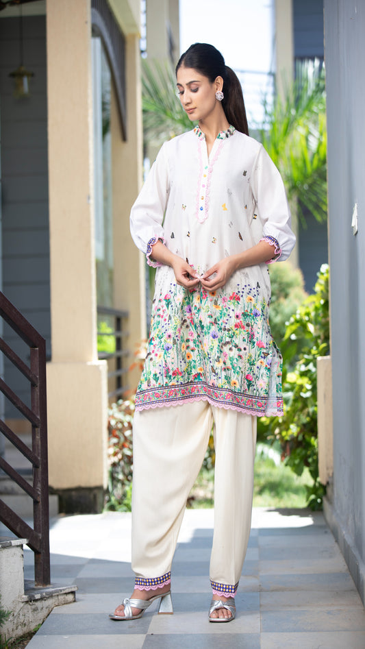 Ira Ivory Cotton Linen Kurta Set – V Neck, Bell Sleeves