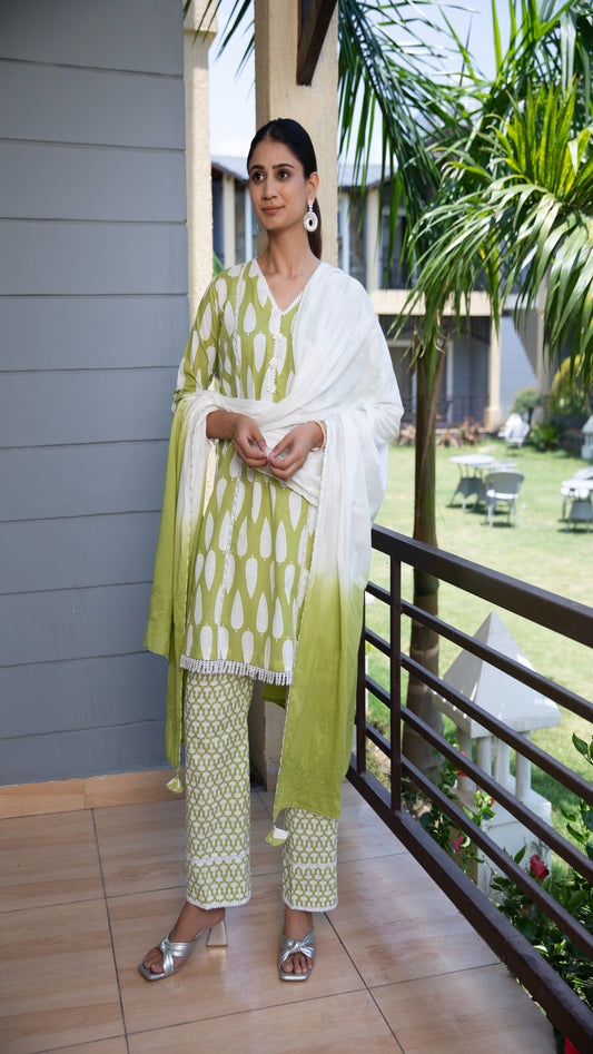 Kiara Green Cotton Kurta Set – V Neck, 3/4 Sleeves