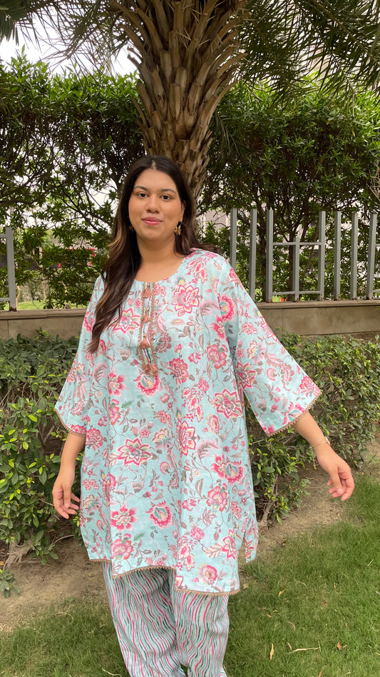 Myra Turquoise Cotton Linen Kurta Set – Bell Sleeves, Breezy & Elegant
