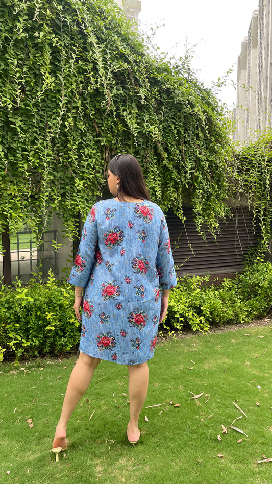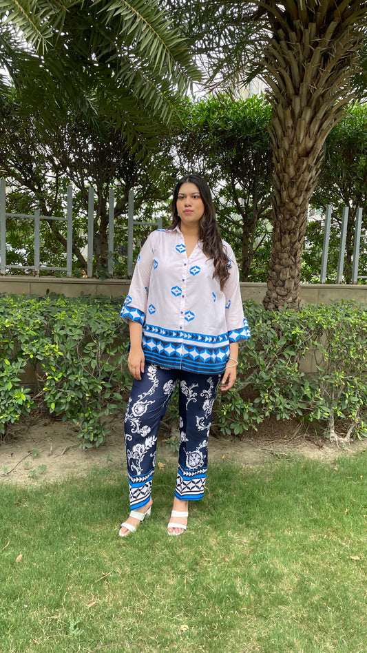 Zoya White & Blue Cotton Linen Co-ord Set – Shirt Collar, 3/4 Cuff Sleeves
