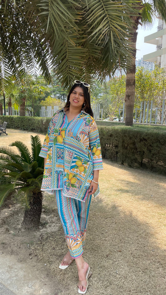 Tia Turquoise Cotton Linen Co-ord Set – Shirt Collar, 3/4 Cuff Sleeves