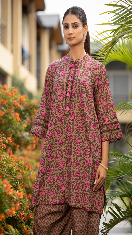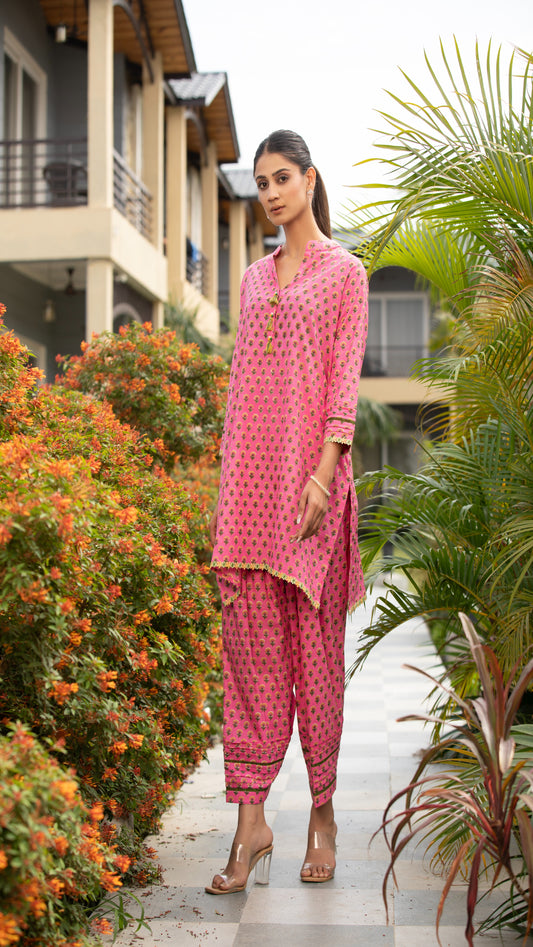 Tara Rose Pink Cotton Kurta Set – Mandarin Collar, 3/4 Sleeves