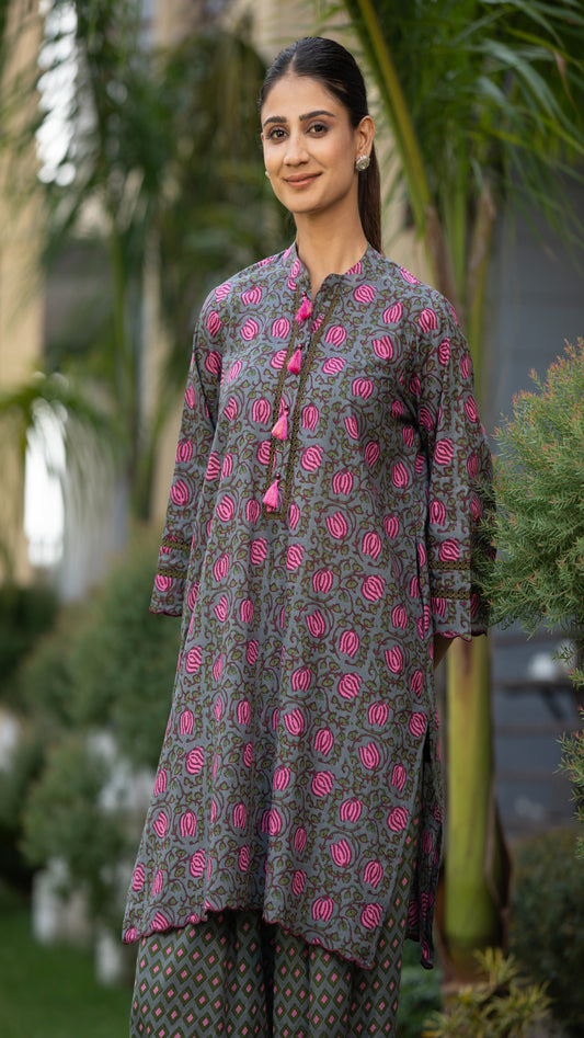 Ruhani Ash Grey Cotton Bell Sleeve Kurta Set – A-Line with Chinese Collar