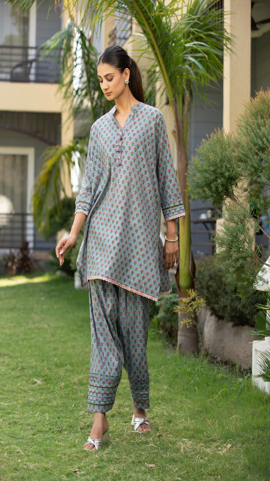 Scalloped Elegance Cotton Denium Co-Ord with Shoulder Cut Work