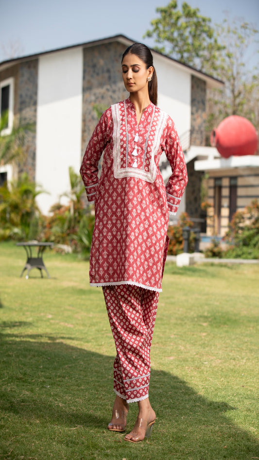 Myra Maroon Cotton Kurta Set – Round Neck, 3/4 Sleeves