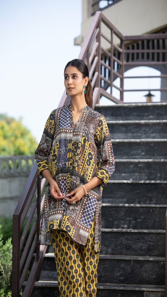 Saanvi Mustard Cotton Co-ord Set – Mandarin Collar, 3/4 Sleeves