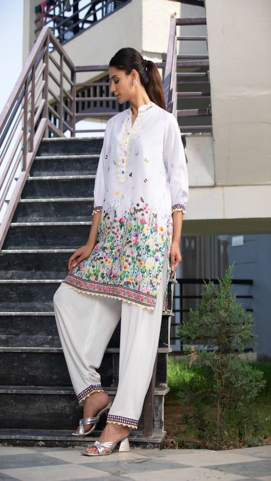 Chambric Cotton Delight - V-Neck Floral Kurta with White Pants