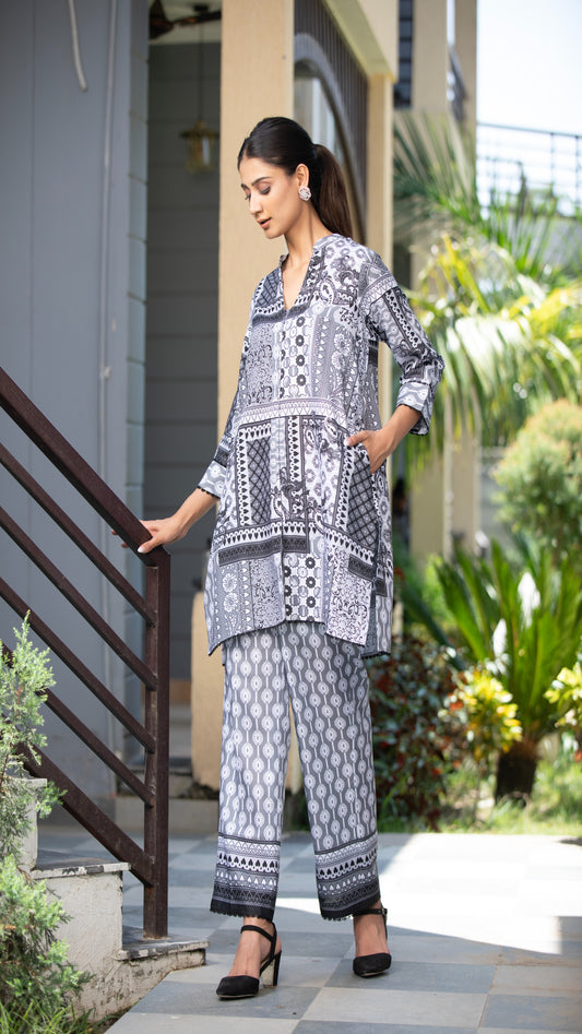 Mira Grey Cotton Linen Co-ord Set – Mandarin Collar, 3/4 Sleeves with Cuff