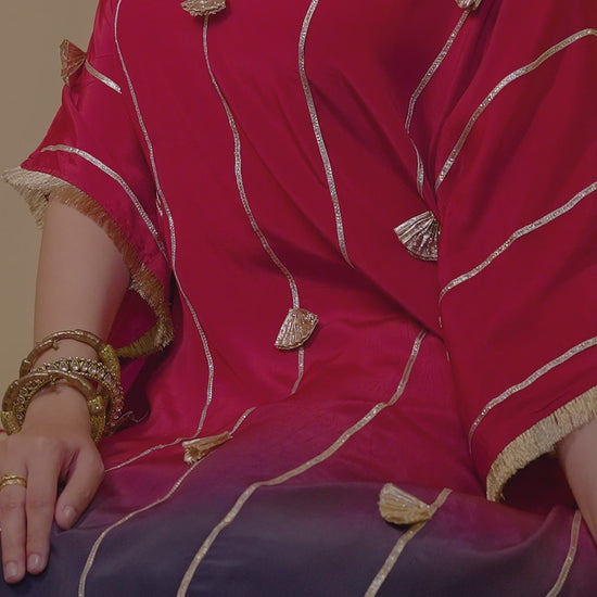 Elevate your style with our Double-Shaded Navy Blue Kaftan, adorned with delicate Gota work lines and a Gota flower, complemented by Zari tassels. Paired with a matching Churidar, this Crape ensemble offers a fusion of tradition and modernity. The set includes one exquisite kaftan, featuring intricate machine embroidery designs.