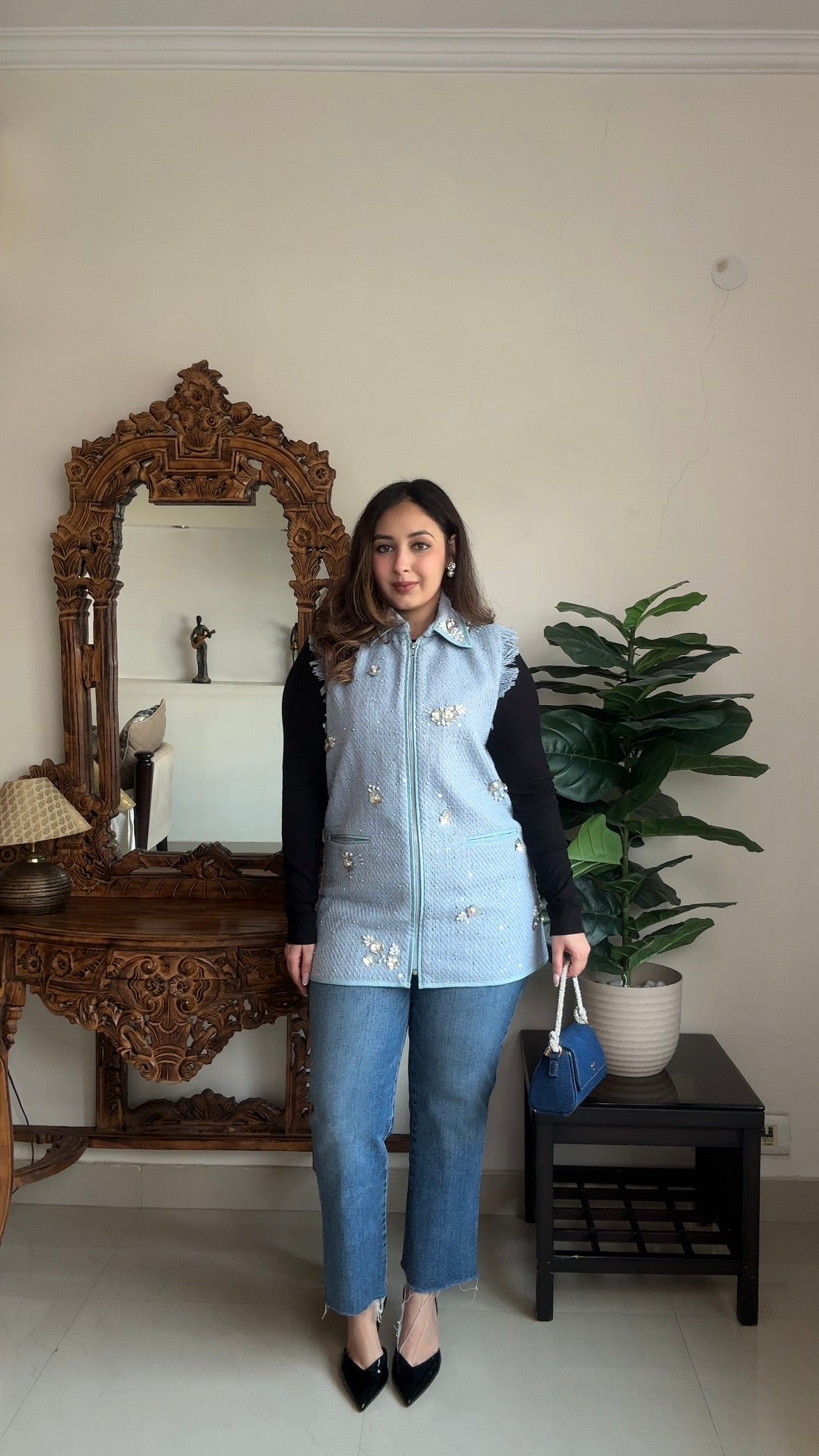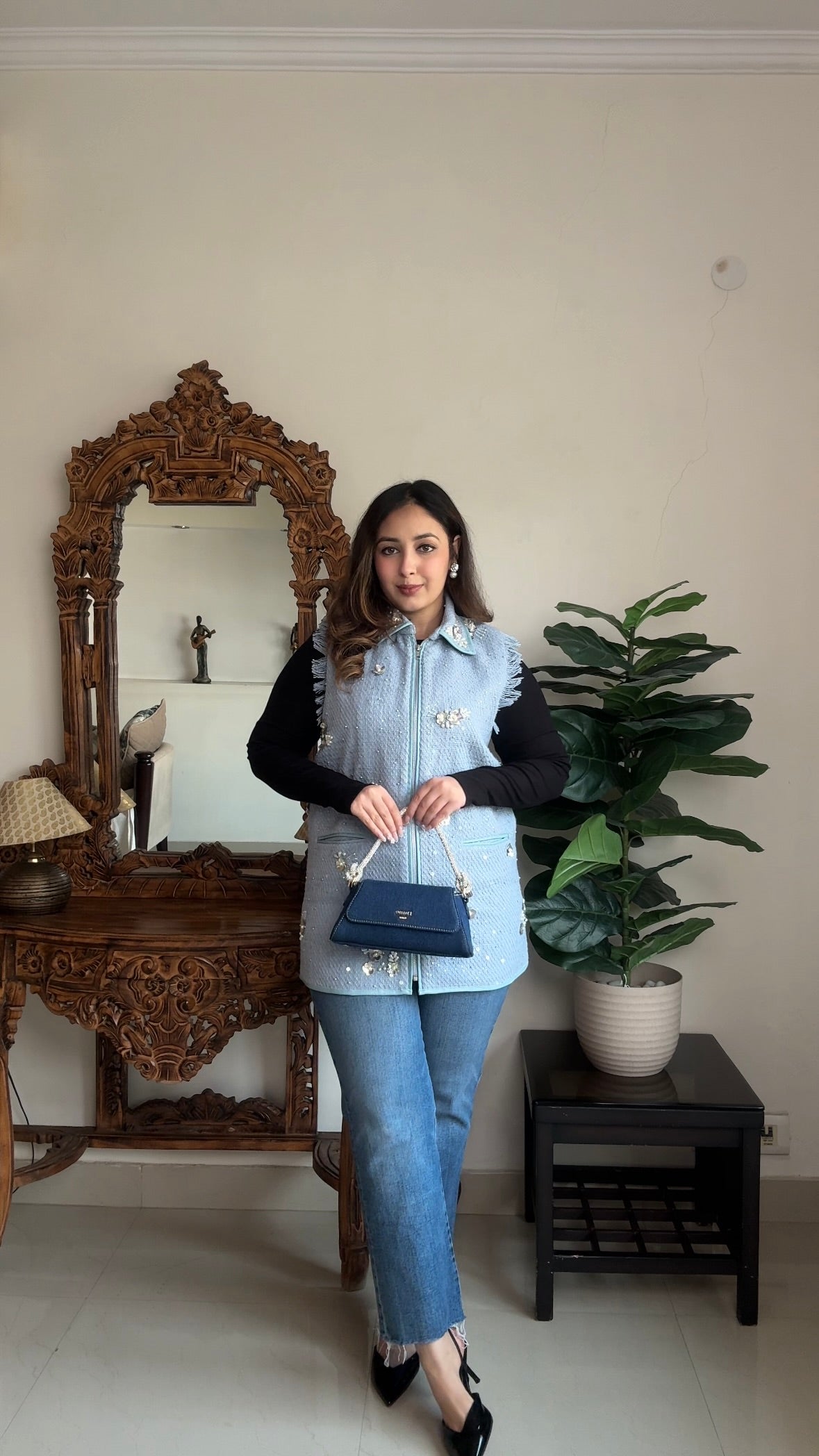 Upgrade your winter style with this elegant embellished tweed sleeveless coat. Designed with intricate handwork, soft inner lining, and a structured silhouette — perfect for pairing with denims, boots, and winter tops. A timeless wardrobe essential for chic everyday fashion.