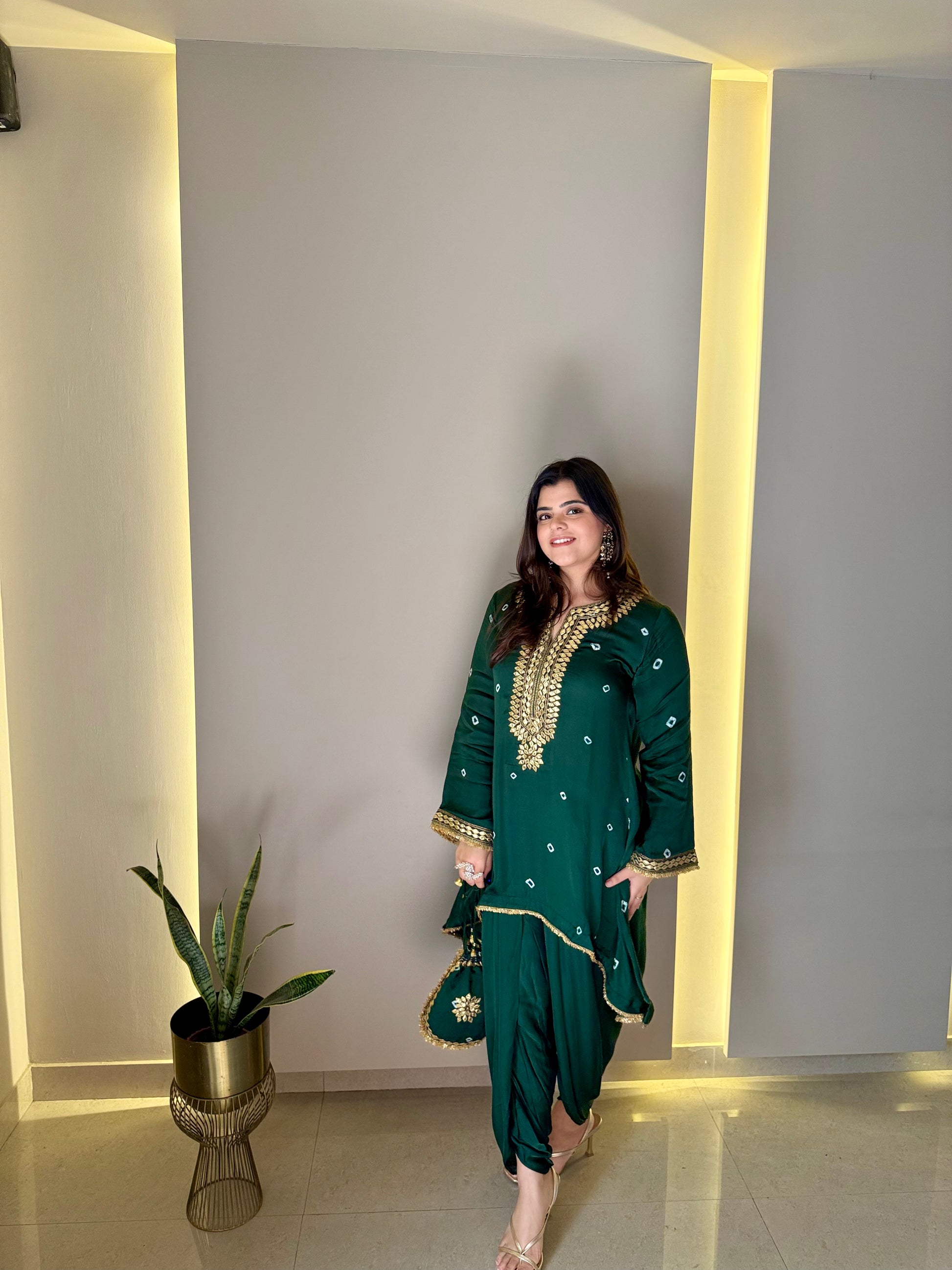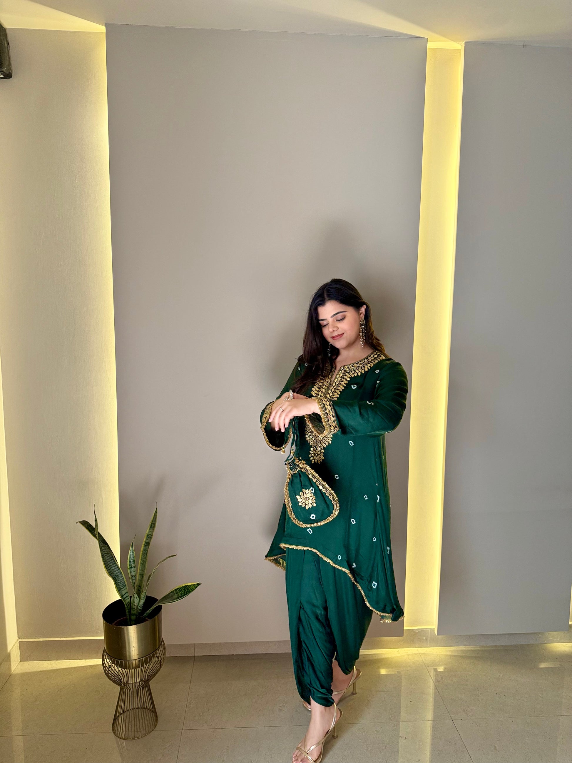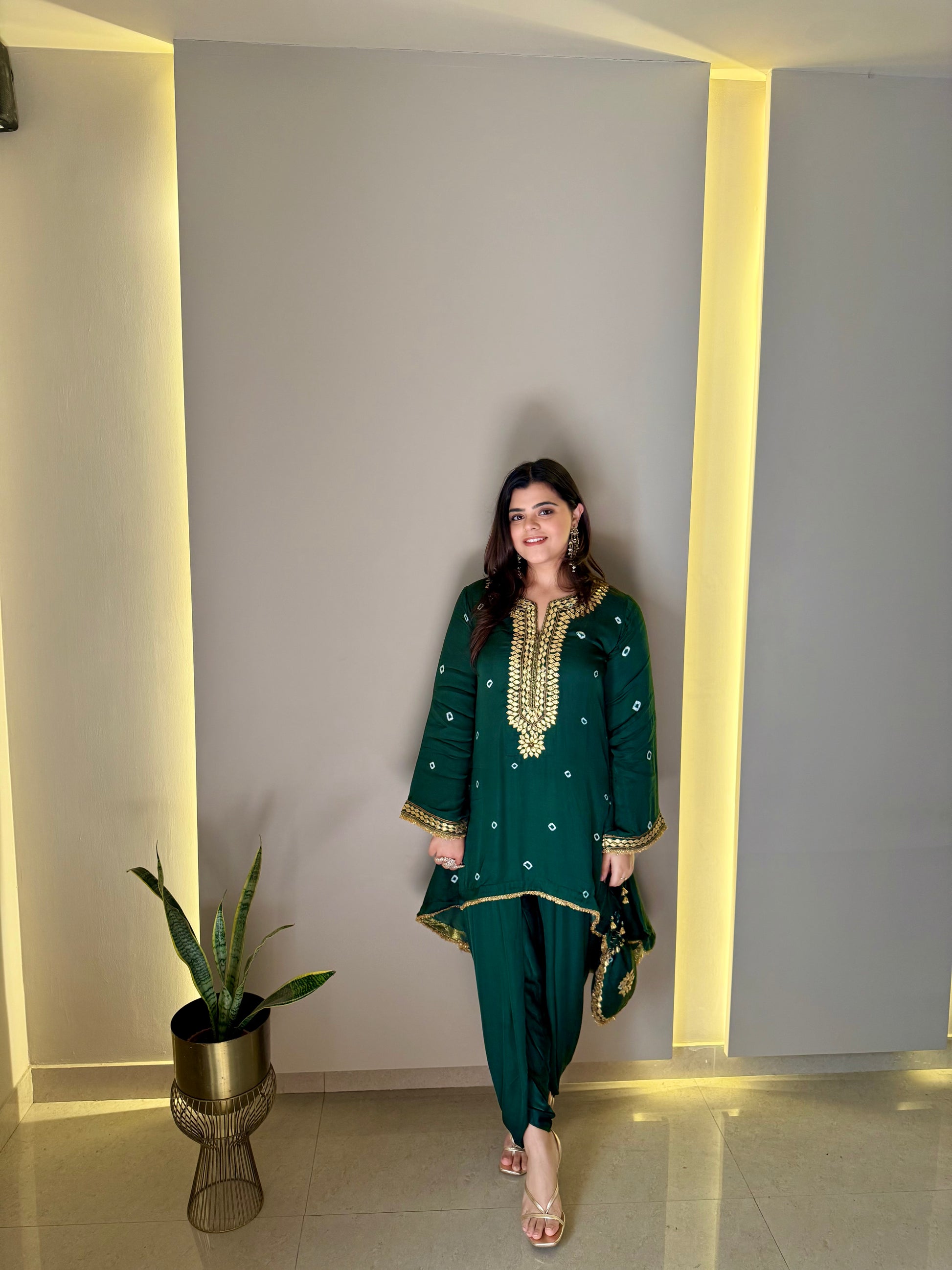 ✨ Kurta: Designed in luxurious modal satin, the high-low A-line kurta is highlighted with a gorgeous gotta patti neckline, adding festive sparkle.